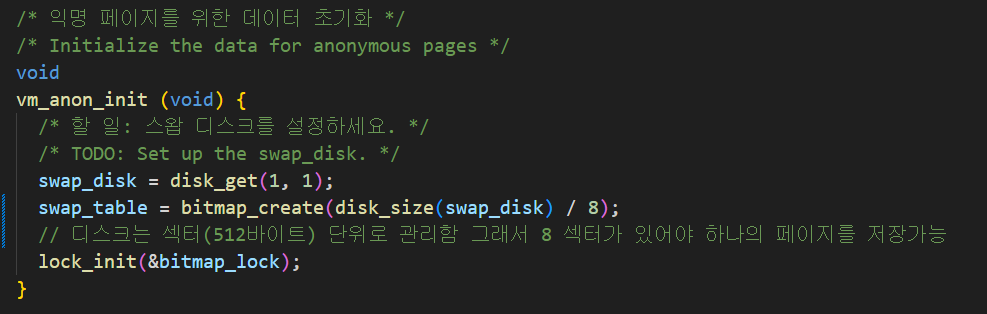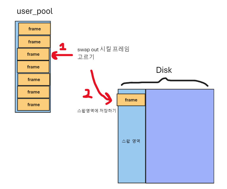 - 나중에 swap disk에서 진짜 frame 을 찾기위해 frame 구조체에 해당 공간 위치(인덱스)를 저장한다.