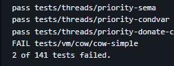 static void anon_destroy (struct page *page) { struct anon_page *anon_page = &page->anon; // 스왑 테이블에서 스왑 인덱스 해제 if (anon_page->swap_idx != BITMAP_ERROR) { lock_acquire(&bitmap_lock); bitmap_reset(swap_table, anon_page->swap_idx); lock_release(&bitmap_lock); } // 프레임이 존재하면 프레임을 리스트에서 제거하고 해제 if (page->frame) { list_remove(&page->frame->elem); page->frame->page = NULL; palloc_free_page(page->frame->kva); // <<<<< 여기 추가함!!!! free(page->frame); page->frame = NULL; } pml4_clear_page(thread_current()->pml4, page->va); }후... 이제 정말 cow와 swap-fork를 제외한 모든 테스트를 통과한다.