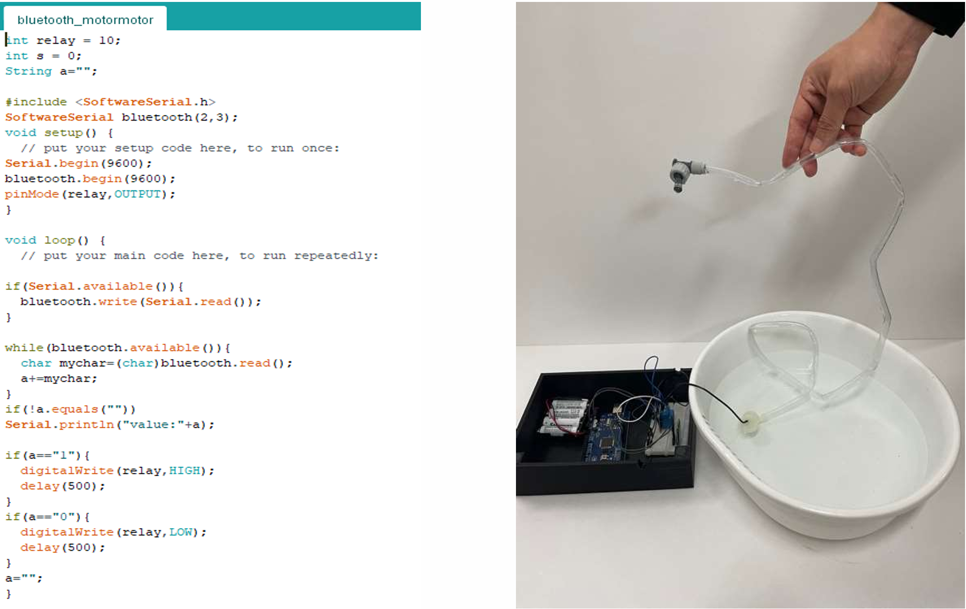 살수부 코드와 하드웨어 초기형태 제어부로부터 블루투스 신호를 받으면 펌프를 on/off 합니다.