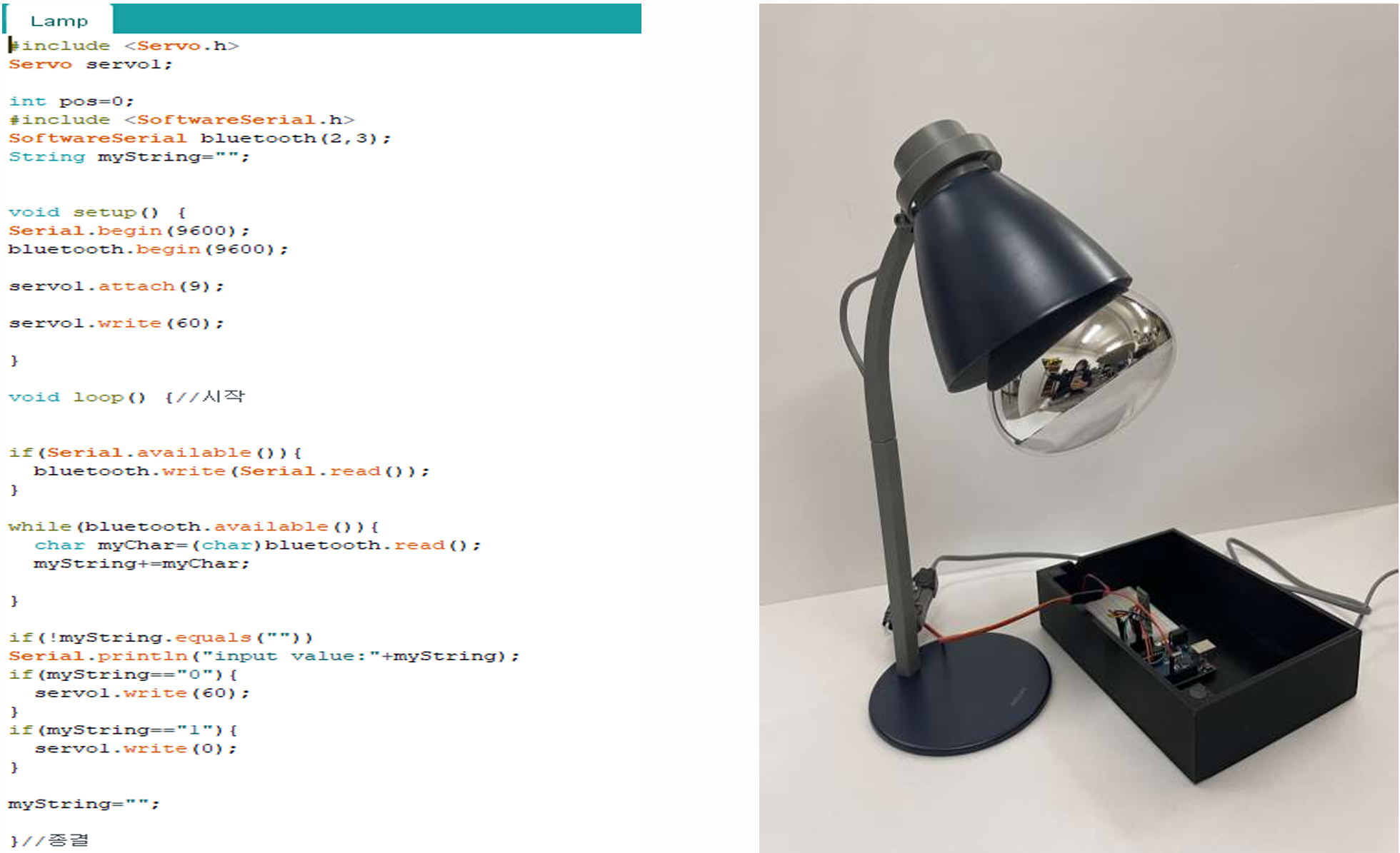 난방부 코드와 하드웨어 모습 제어부로 부터 블루투스 신호를 받으면 램프를 on/off 합니다.