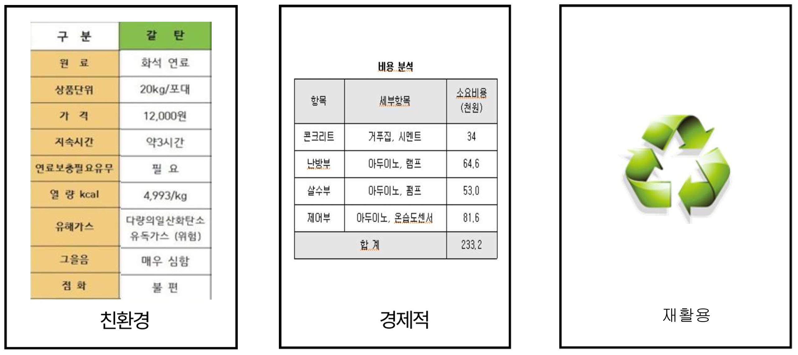 기존 화석 연료 방식과 의 유지비용, 기기 비용 비교, 재활용 가능성 단순히 대회용으로 만들려는 프로젝트가 아니라 실제로 사용할 가치가 있는 제품을 만들고 싶었고, 그러기 위해서는 기존 방식보다 경제적이여야 한다고 생각했습니다.
