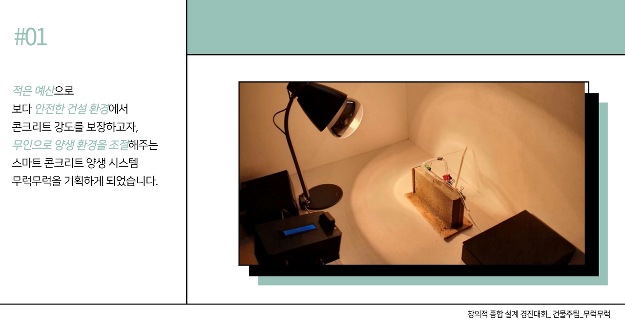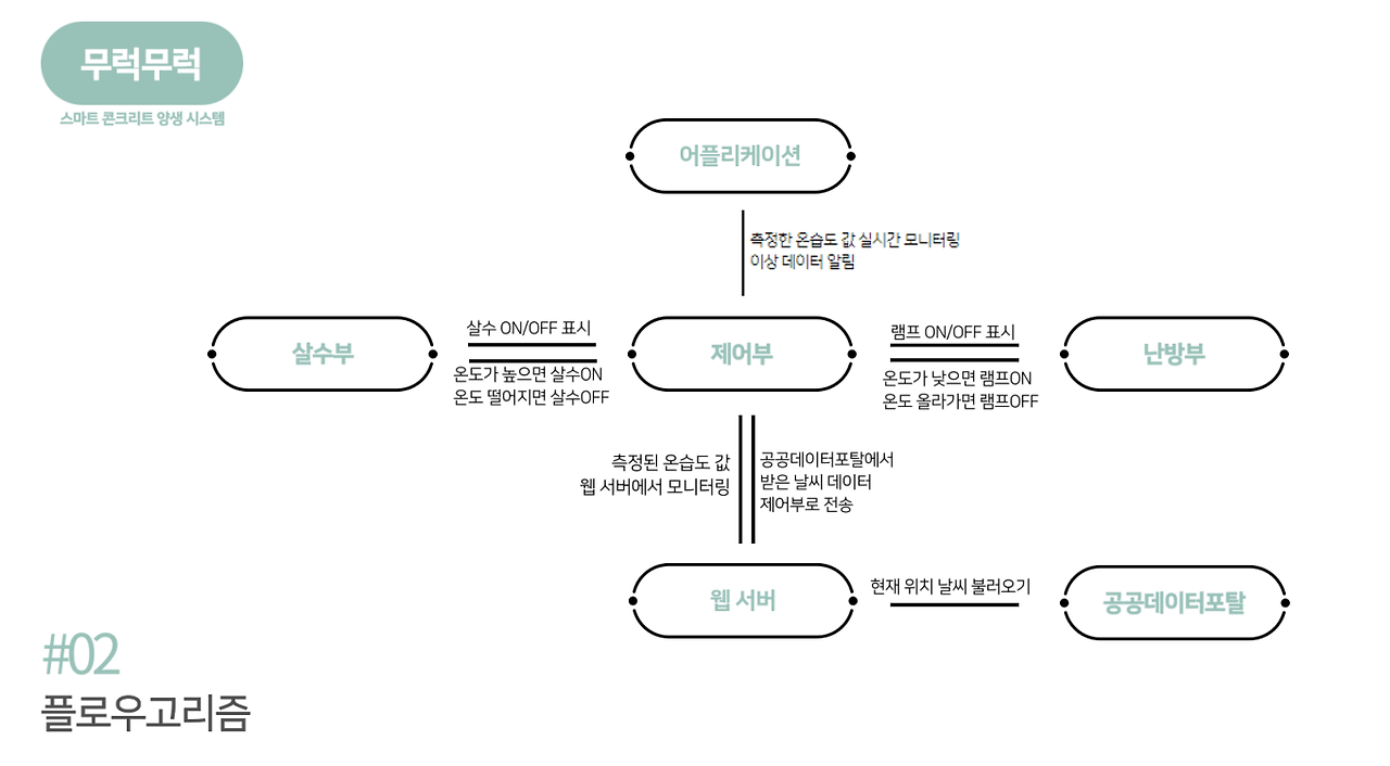 - 센서를 기반으로 온도와 습도 조절을 자동화해 무인으로 공백없이 정확하고 균일한 품질의 콘크리트를 양생 할 수 있음.