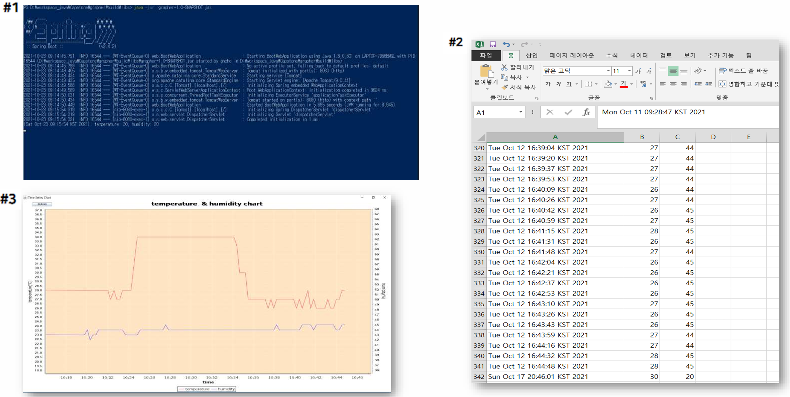 1.웹서버 2. 공공데이터 포탈 온습도 정보 3. 그래프 제가 만든 부분은 아니지만 스프링으로 공공데이터 포탈에서 온습도 정보를 받아오는 서버에 아두이노 기기가 wifi로 접속하여 해당 정보를 받아옵니다.