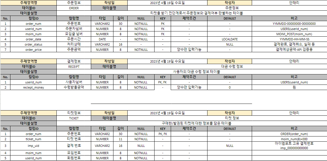 사용자정보 모임정보 주문정보 티켓정보 대금수령 USERS MOIM_POST ORDER TICKET RECEIPT 각각의 테이블들이 필요합니다.