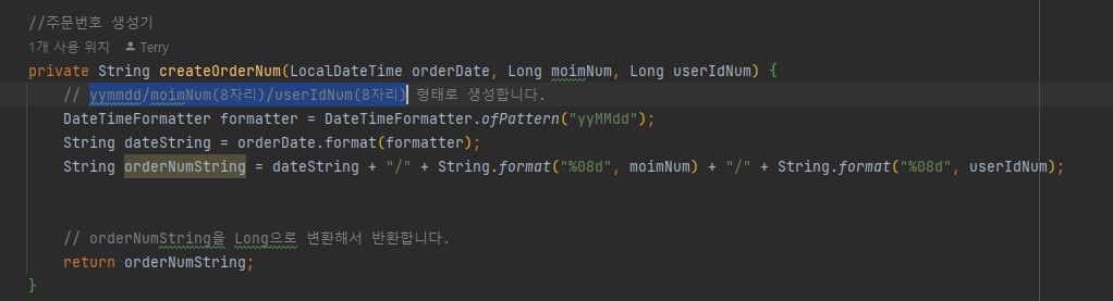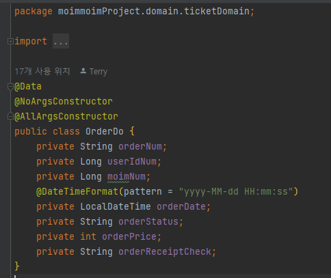 - 구매 버튼을 누르면 orderDo 주문객체가 생성된다. [주문 번호]는 `주문 날짜` + 구매하려는 `모임번호` + 구매자의 `회원 번호` 이다.