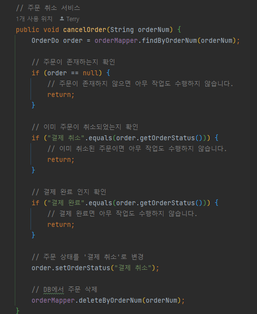 - 주문 상태가 `결제 취소` 이면 order 테이블에서 해당 행을 삭제한다.