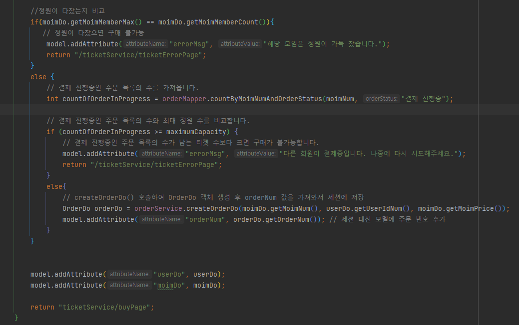 - 아니라면, order 테이블에서 주문상태가 `결제 진행중`인 주문 목록의 수를 불러와서 남은 정원수와 비교하기