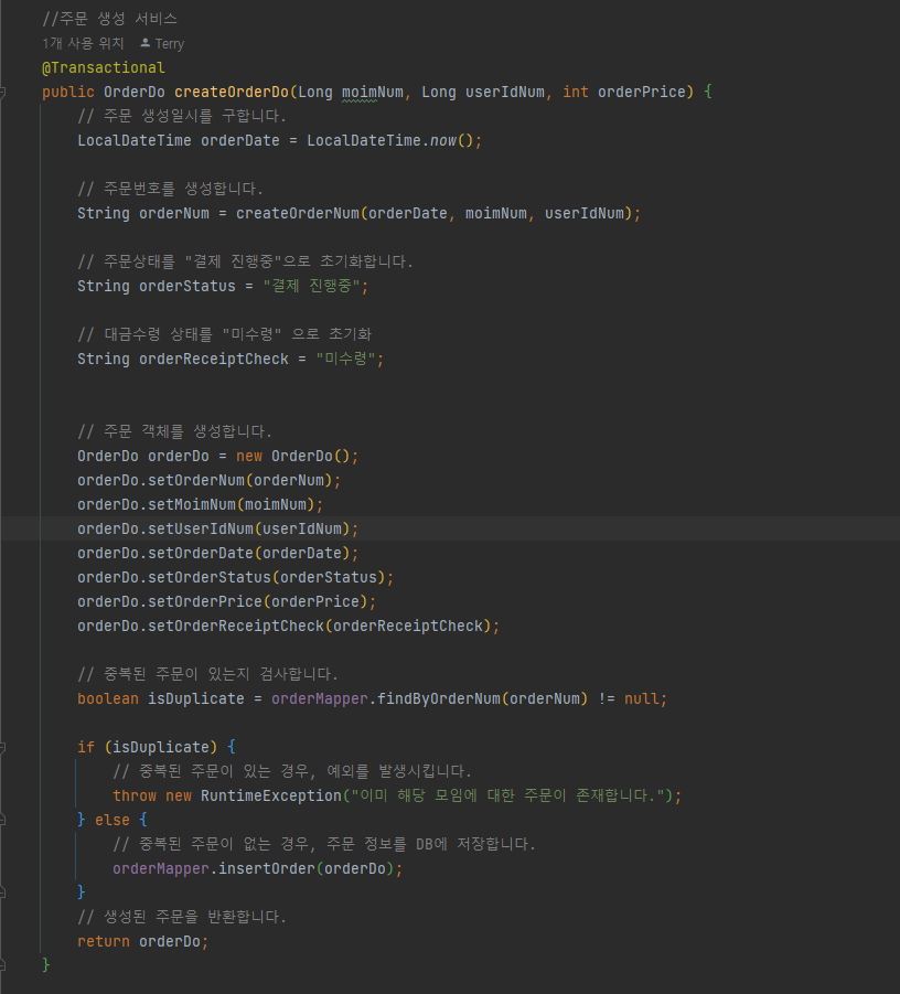 - order 테이블에서 [주문번호] 를 통해 구매하려는 모임번호 + 사용자 회원 번호 조합이 일치하는 행이 있는지 검색해서 중복검사를 진행한다. 중복이 있다면 주문상태가 결제 취소 로 바뀌고 종료된다.