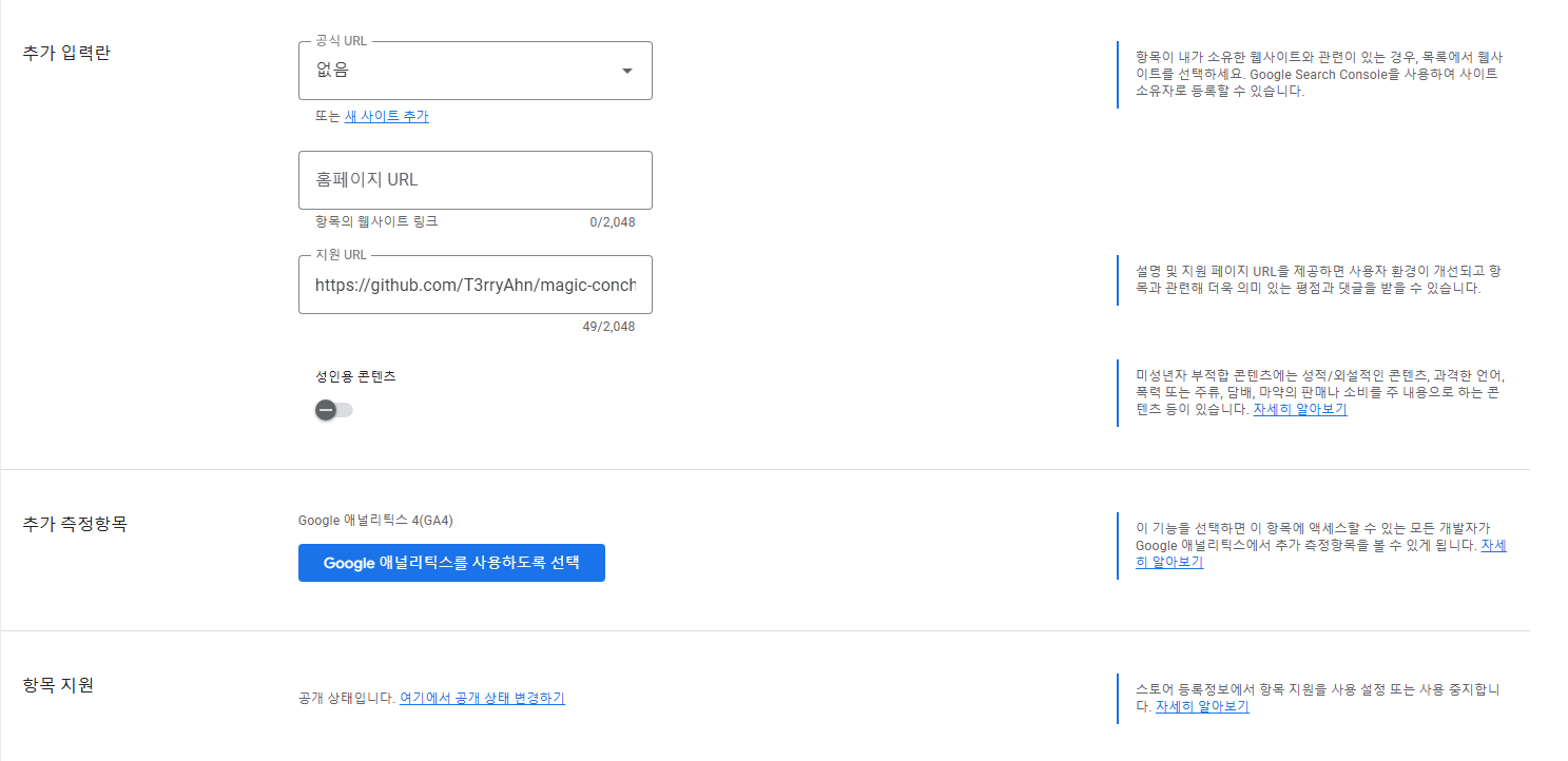 추가 입력란에는 기입하고 싶은데로 하시면 됩니다. 저는 지원 url에만 깃허브 주소를 넣었습니다.