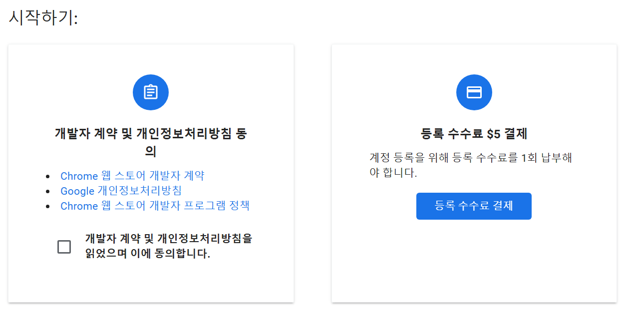 확장 프로그램을 웹스토어에 등록하려면 웹스토어 개발자로 등록을 해야합니다. 5$ 정도 비용이 듭니다.